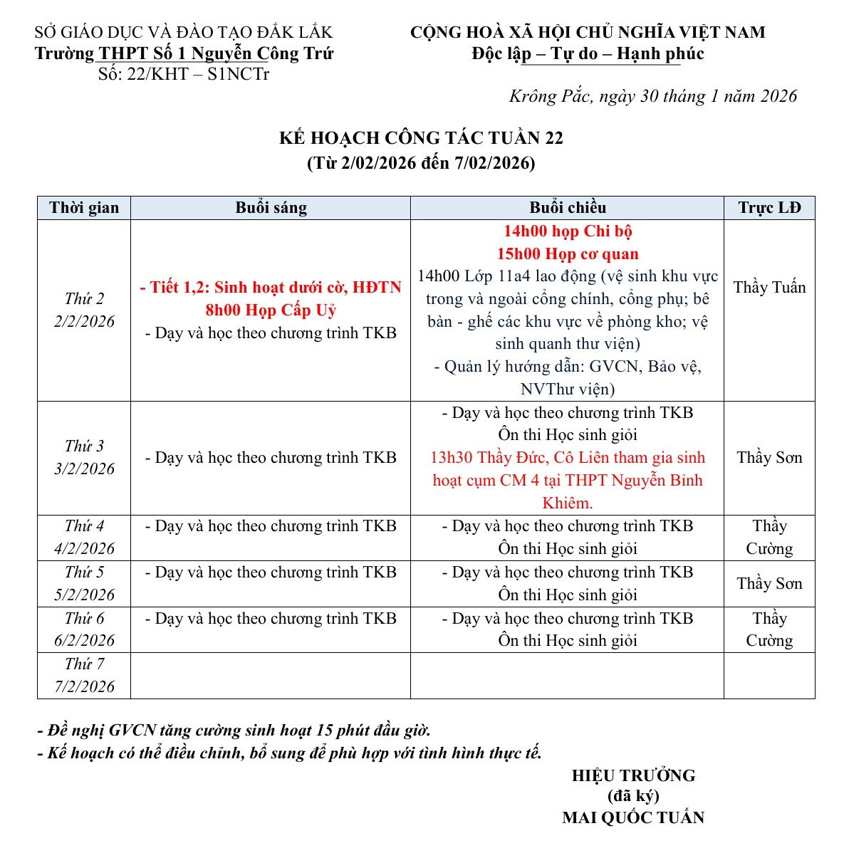Lịch công tác tuần từ ngày 02/02/2026 – 07/02/2026 Năm học 2025-2026 (NCTr Online)