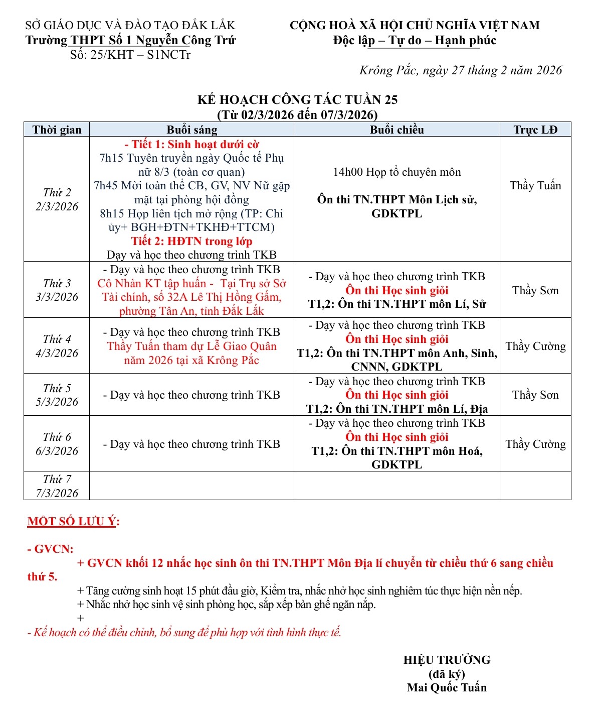 Lịch công tác tuần từ ngày 02/3/2026 – 07/3/2026 Năm học 2025-2026 (NCTr Online)