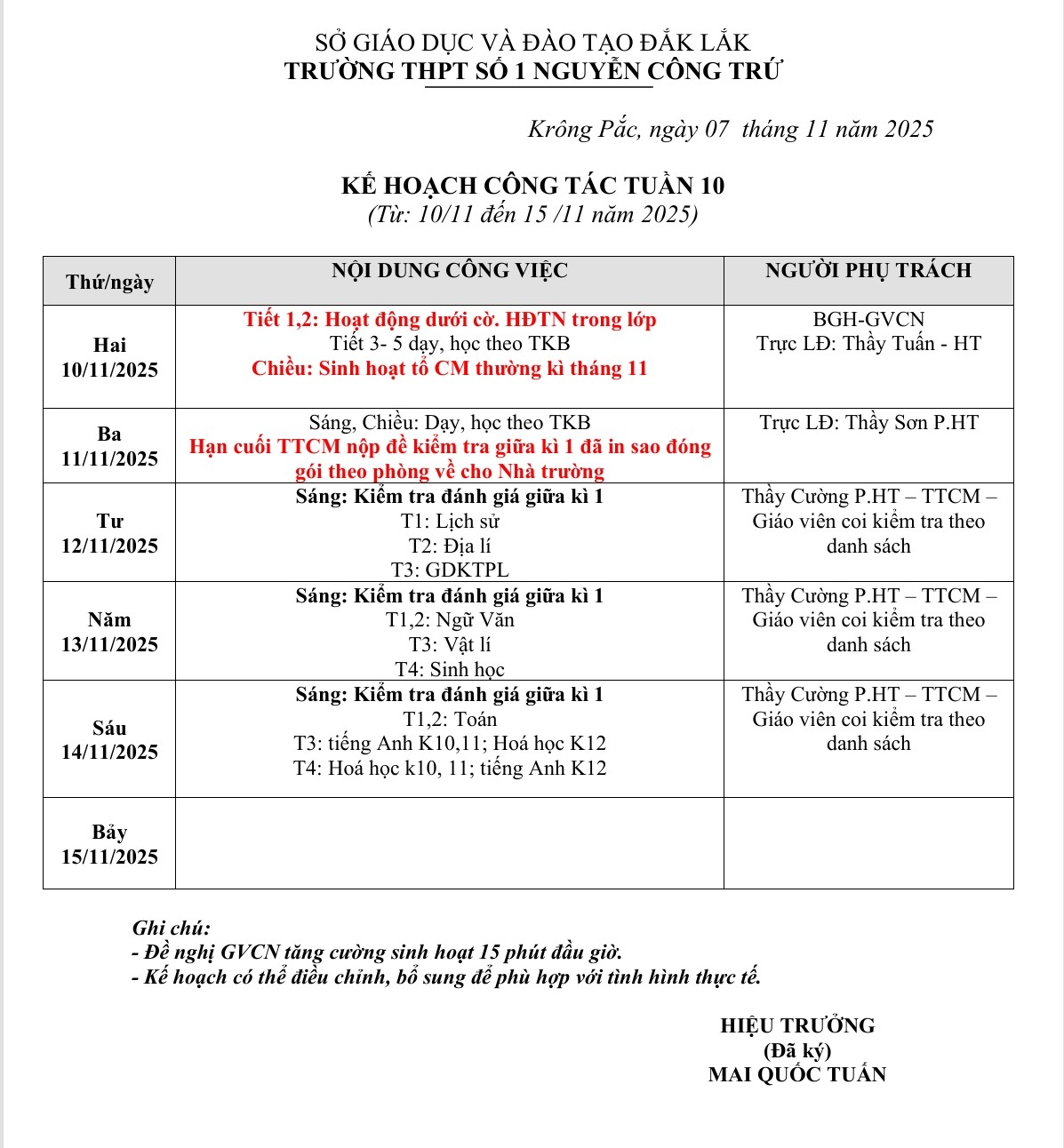 Lịch công tác tuần từ ngày 10/11/2025 – 15/11/2025 Năm học 2025-2026 (NCTr Online)