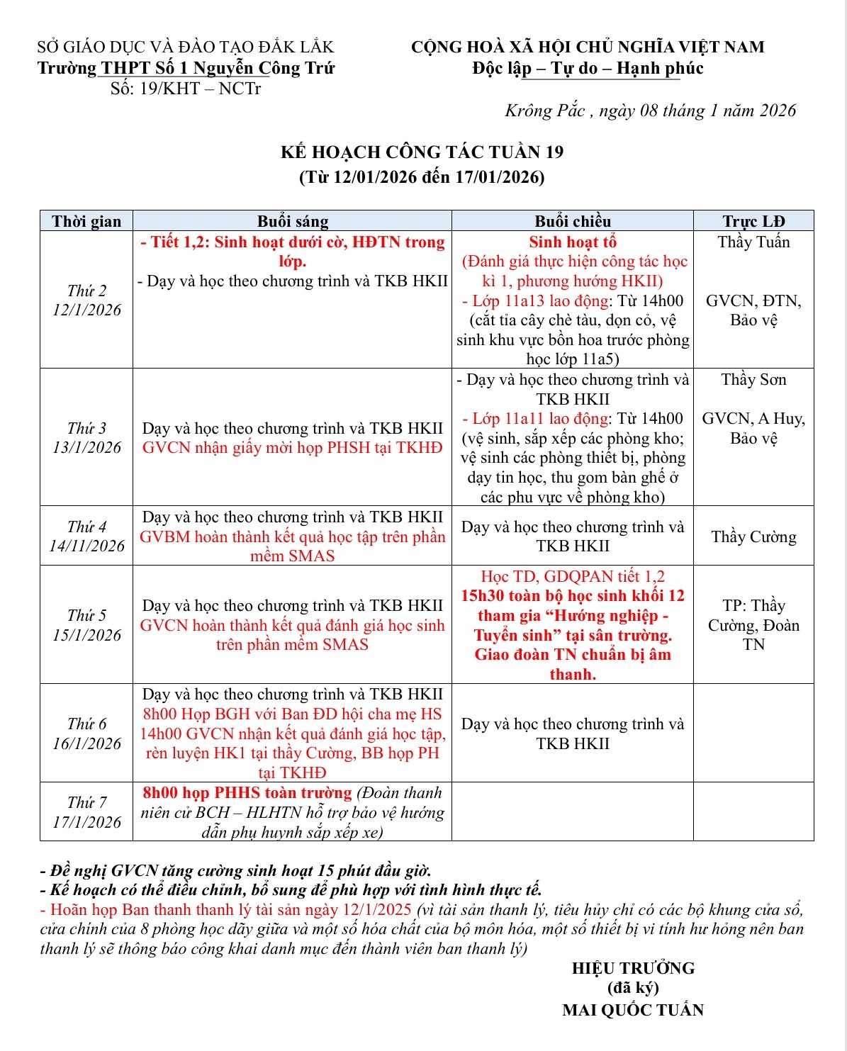 Lịch công tác tuần từ ngày 12/01/2026 – 17/01/2026 Năm học 2025-2026 (NCTr Online)