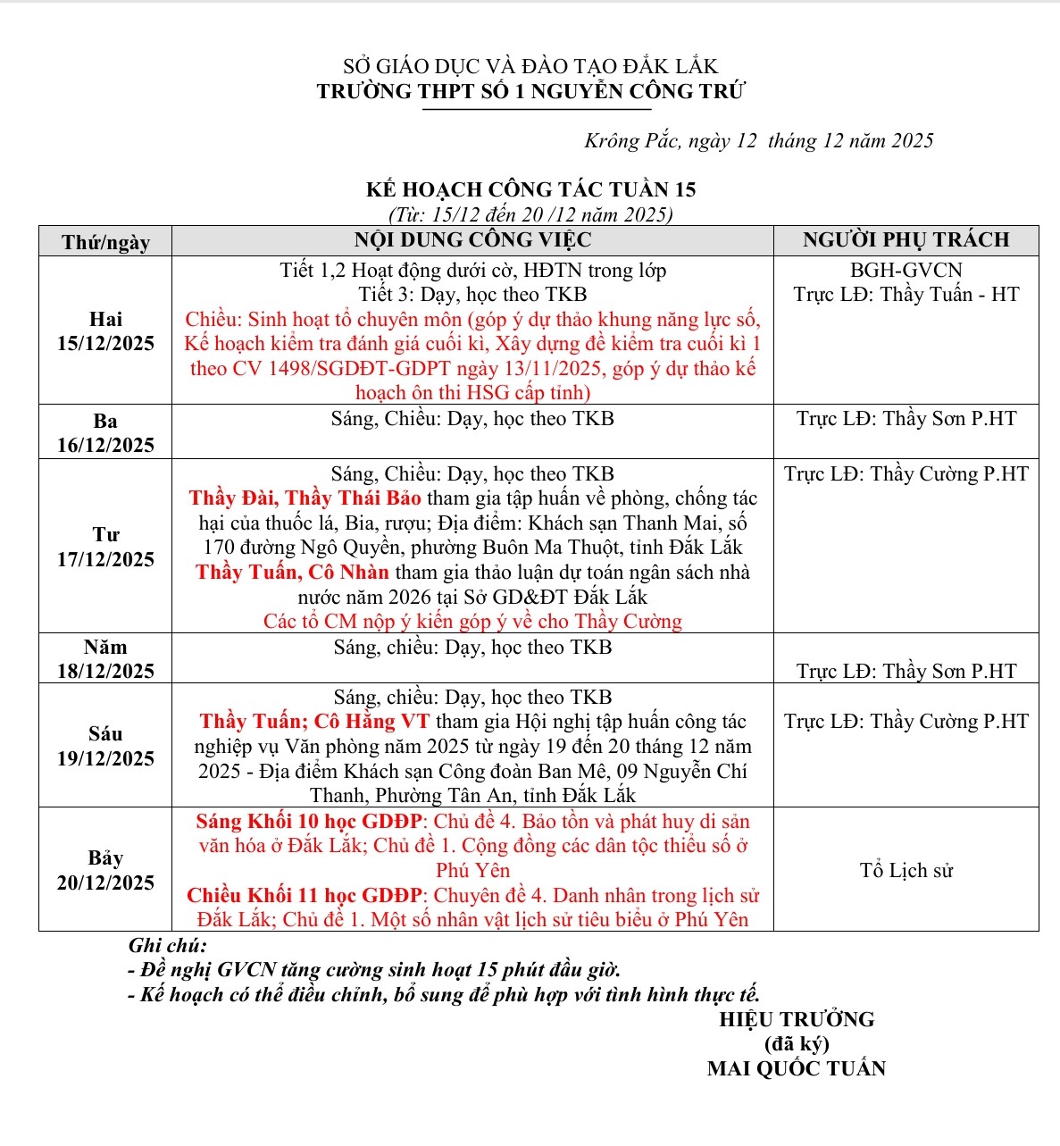 Lịch công tác tuần từ ngày 15/12/2025 – 20/12/2025 Năm học 2025-2026 (NCTr Online)