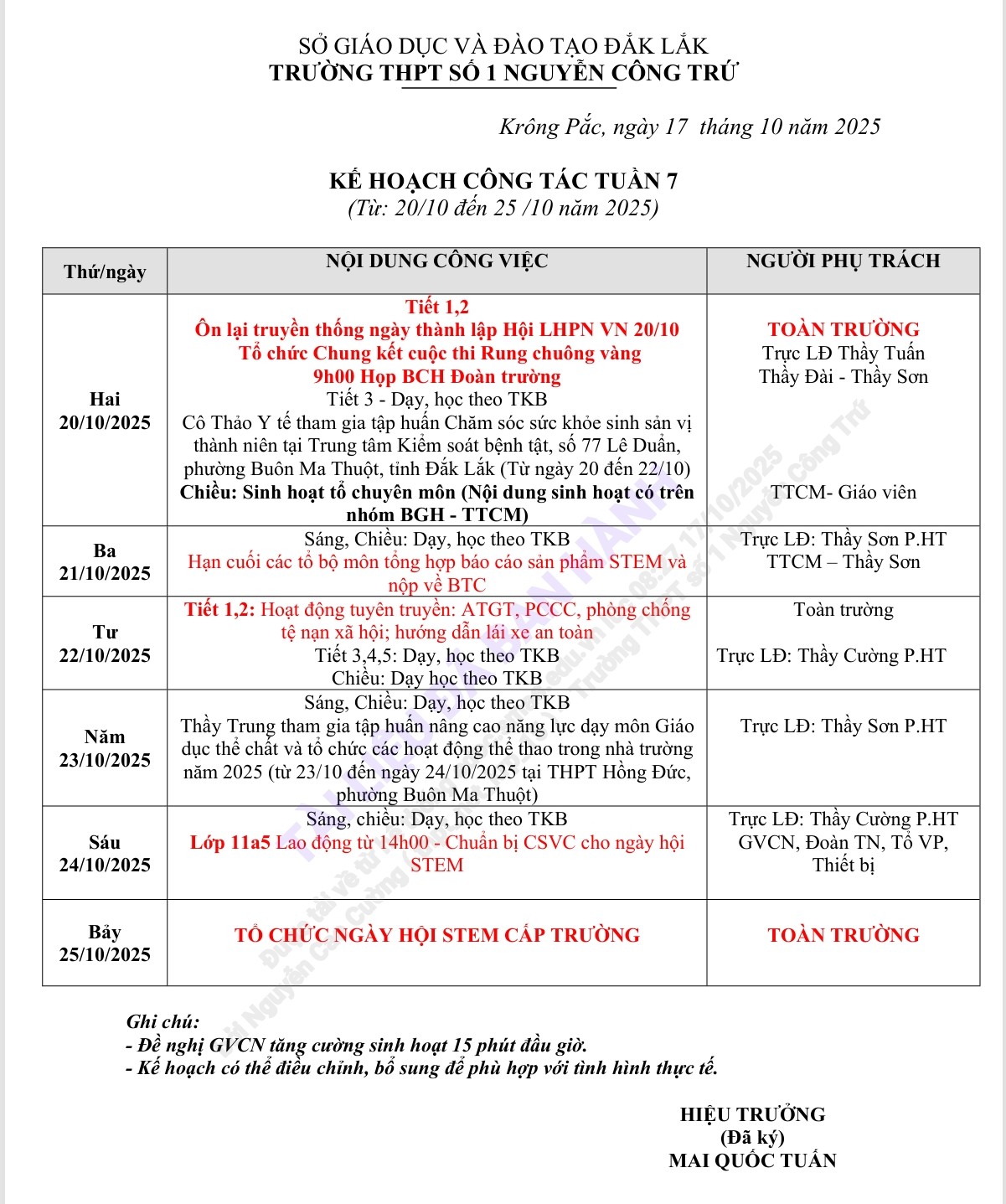 Lịch công tác tuần từ ngày 20/10/2025 – 25/10/2025 Năm học 2025-2026 (NCTr Online)