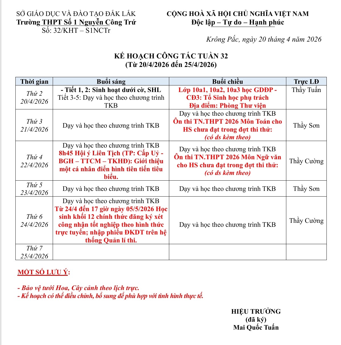 Lịch công tác tuần từ ngày 20/4/2026 – 25/4/2026 Năm học 2025-2026 (NCTrSo1 Online)