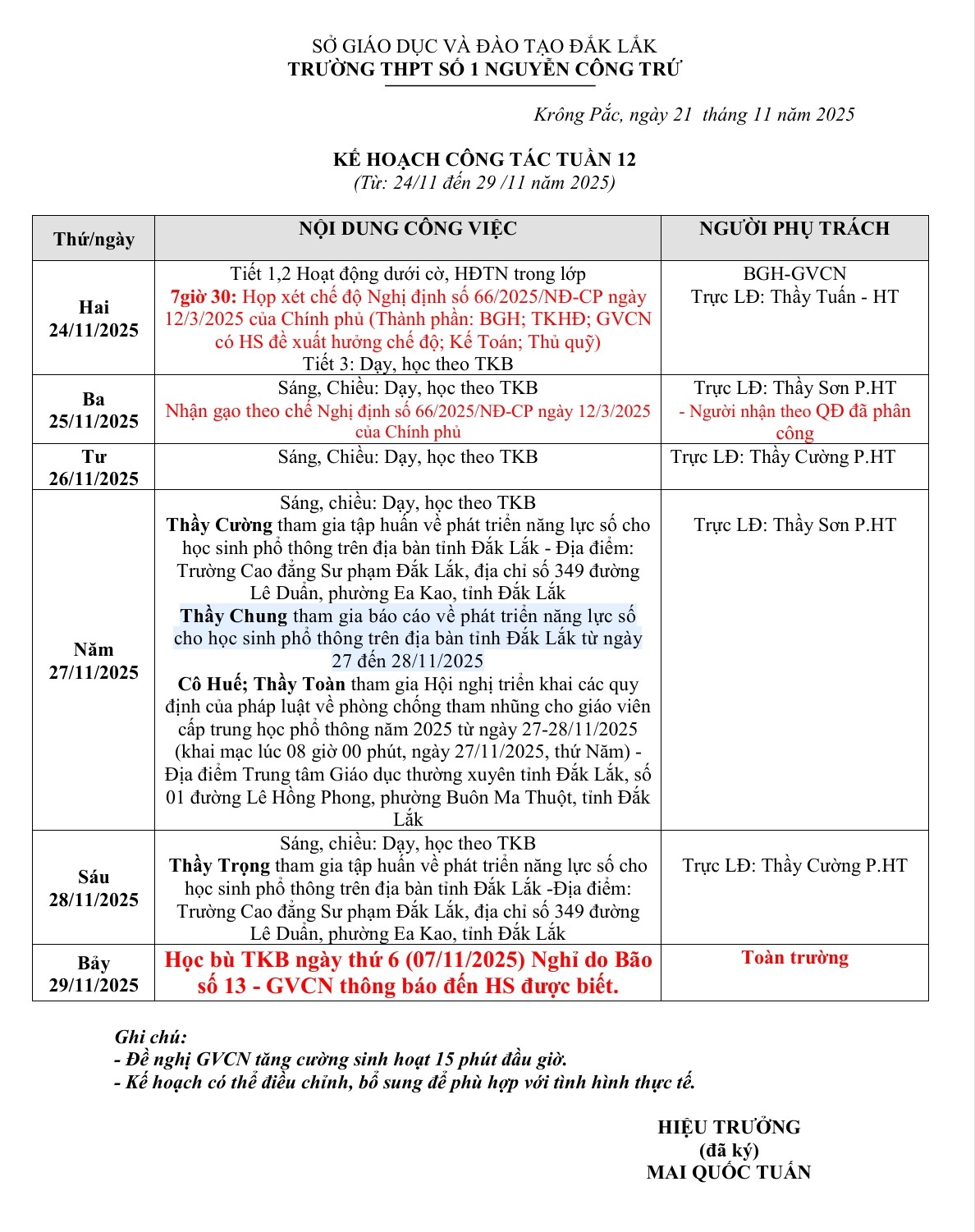 Lịch công tác tuần từ ngày 24/11/2025 – 29/11/2025 Năm học 2025-2026 (NCTr Online)