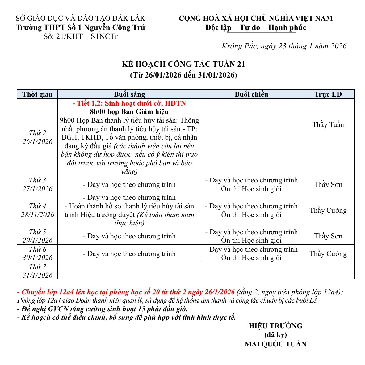 Lịch công tác tuần từ ngày 26/01/2026 – 31/01/2026 Năm học 2025-2026 (NCTr Online)