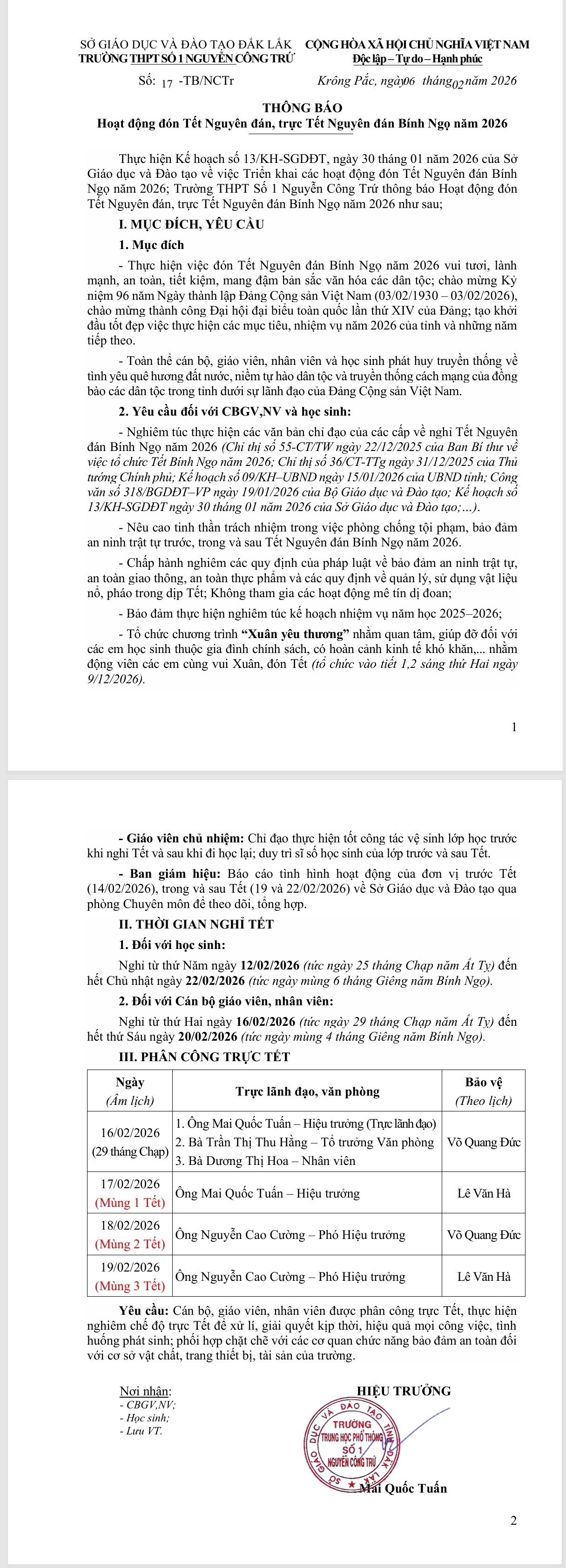 Thông báo hoạt động đón Tết Nguyên đán, trực Tết Nguyên đán Bính Ngọ năm 2026 (NCTr Onlne)