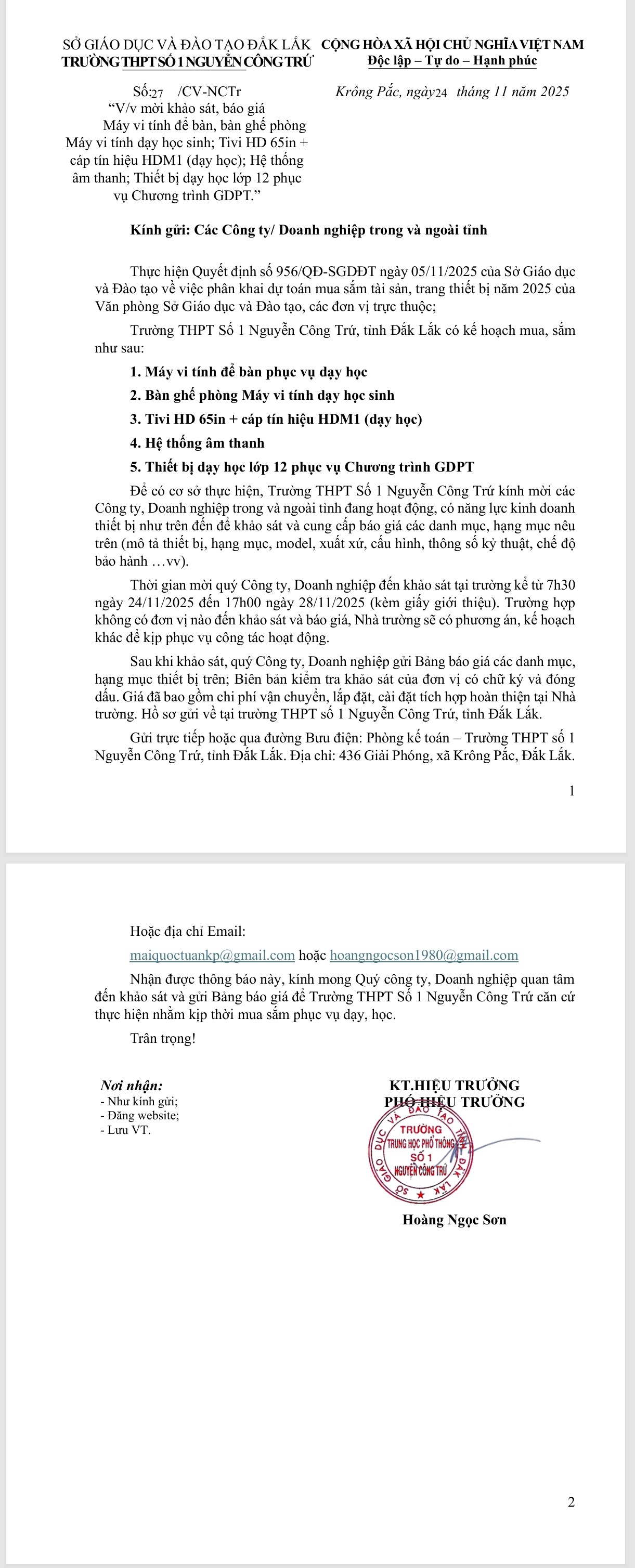Thông báo về việc mời khảo sát, báo giá Máy vi tính để bàn, bàn ghế phòng Máy vi tính dạy học sinh; Tivi HD 65in + cáp tín hiệu HDM1 (dạy học); Hệ thống âm thanh; Thiết bị dạy học lớp 12 phục vụ Chương trình GDPT