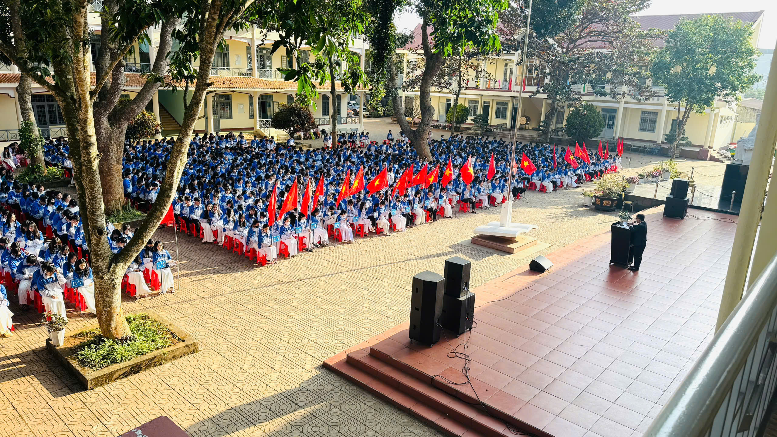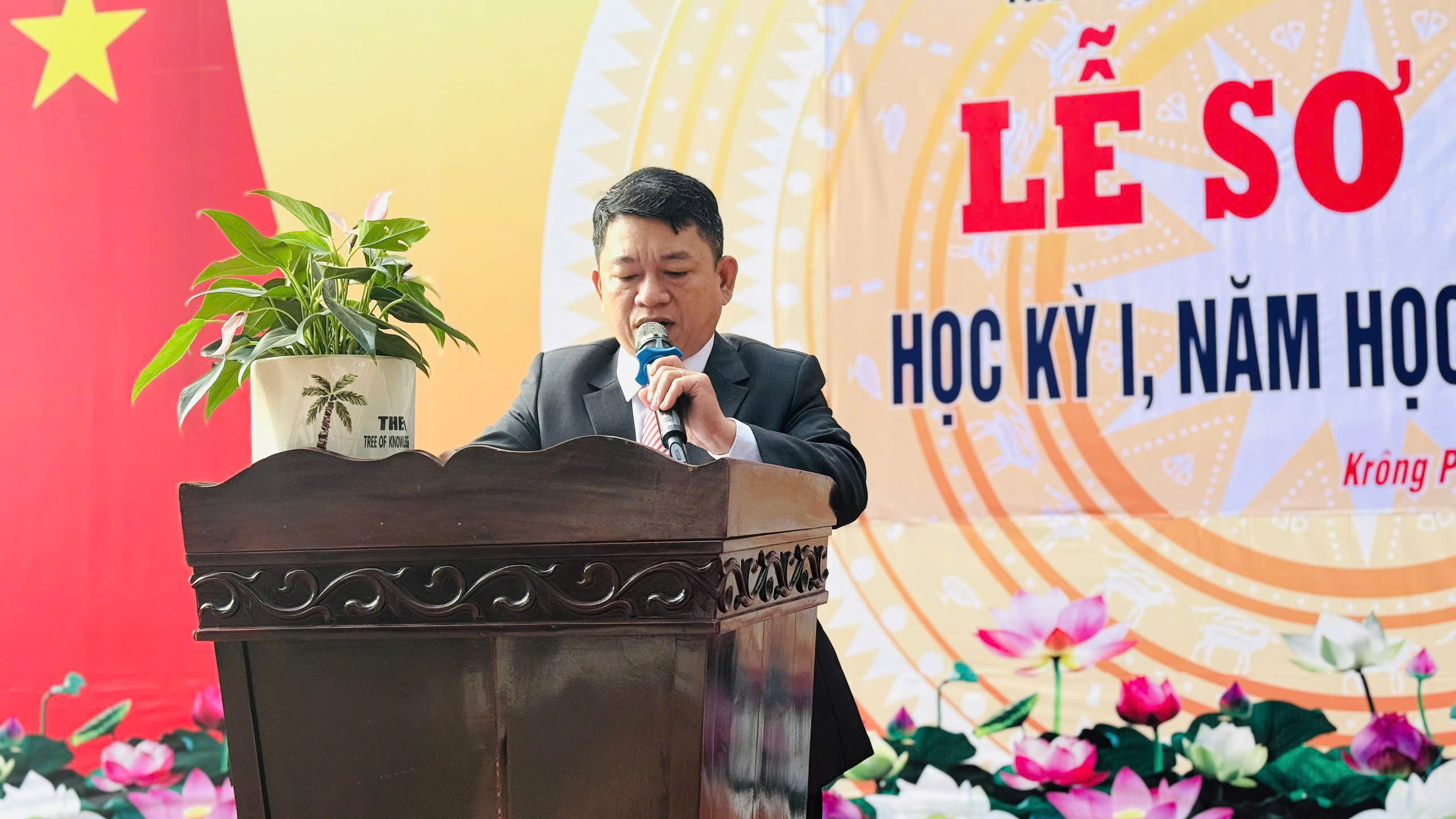 Tại buổi lễ, Thầy giáo Nguyễn Cao Cường – Phó Hiệu trưởng thay mặt Ban Giám hiệu nhà trường đã thông qua Báo cáo sơ kết học kỳ I năm học 2025 – 2026. Báo cáo đã tổng kết những kết quả nổi bật mà nhà trường đã đạt được trong học kỳ vừa qua. Thầy nhấn mạnh sự nỗ lực không ngừng của cả thầy và trò, đồng thời kêu gọi toàn thể học sinh tiếp tục phát huy tinh thần học tập trong học kỳ II.