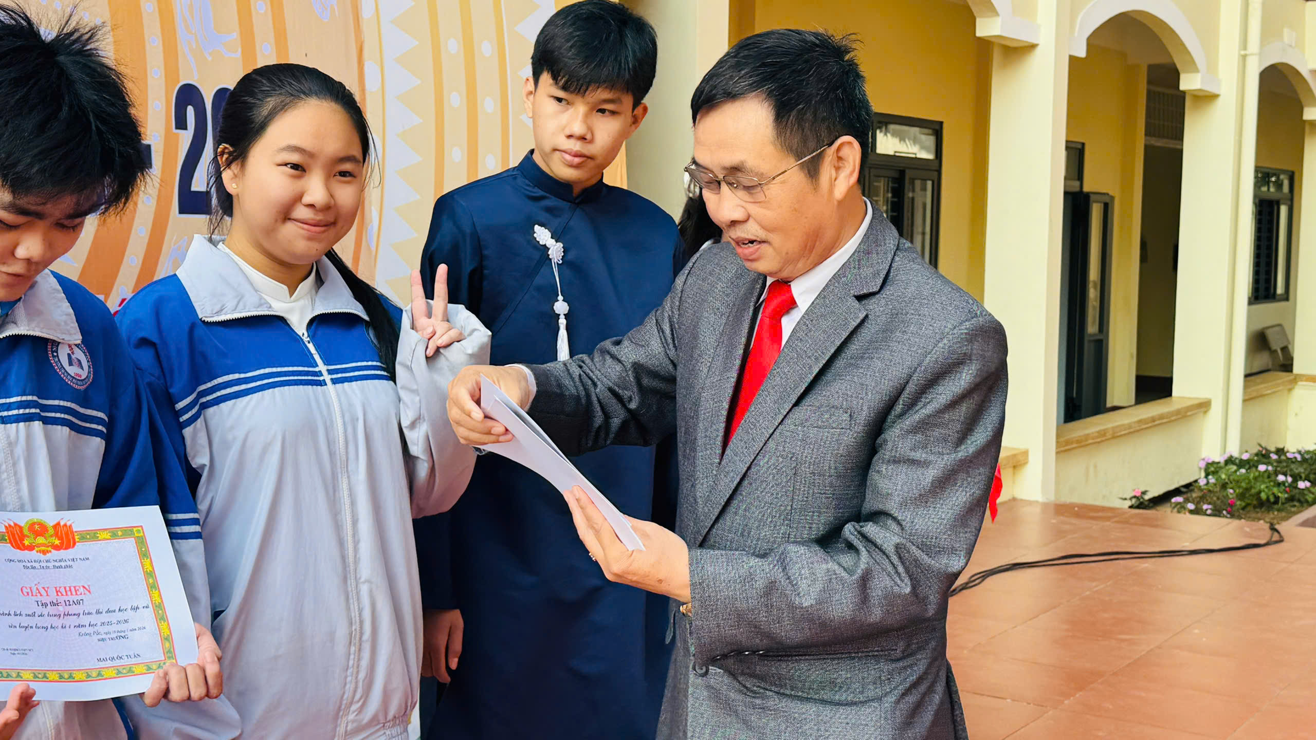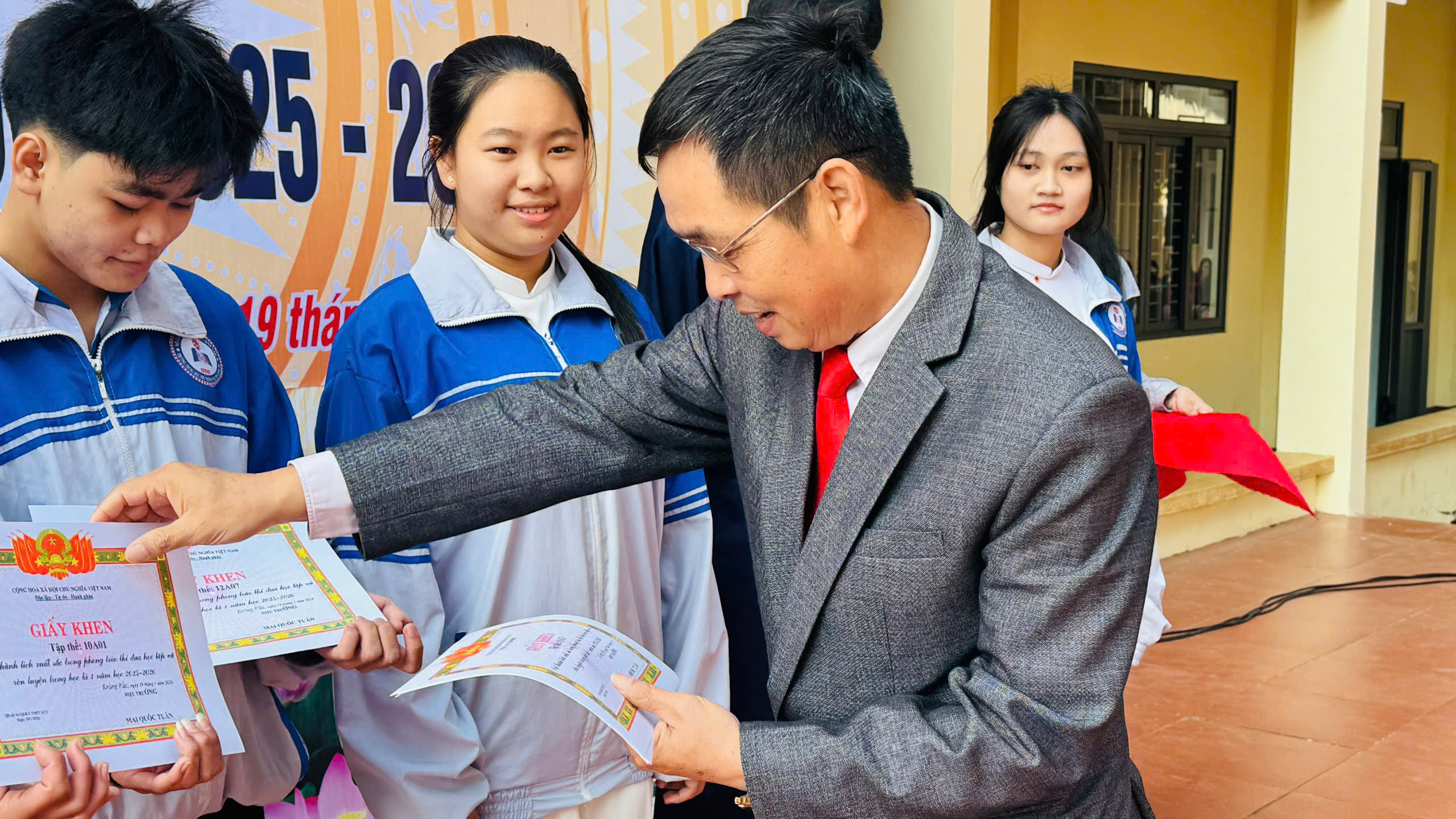 Thầy giáo Mai Quốc Tuấn – Hiệu trưởng nhà trường trao Giấy khen và phần thưởng cho 05 tập thể lớp đạt thành tích Xuất sắc trong phong trào thi đua học kỳ I – Năm học 2025 – 2026.
